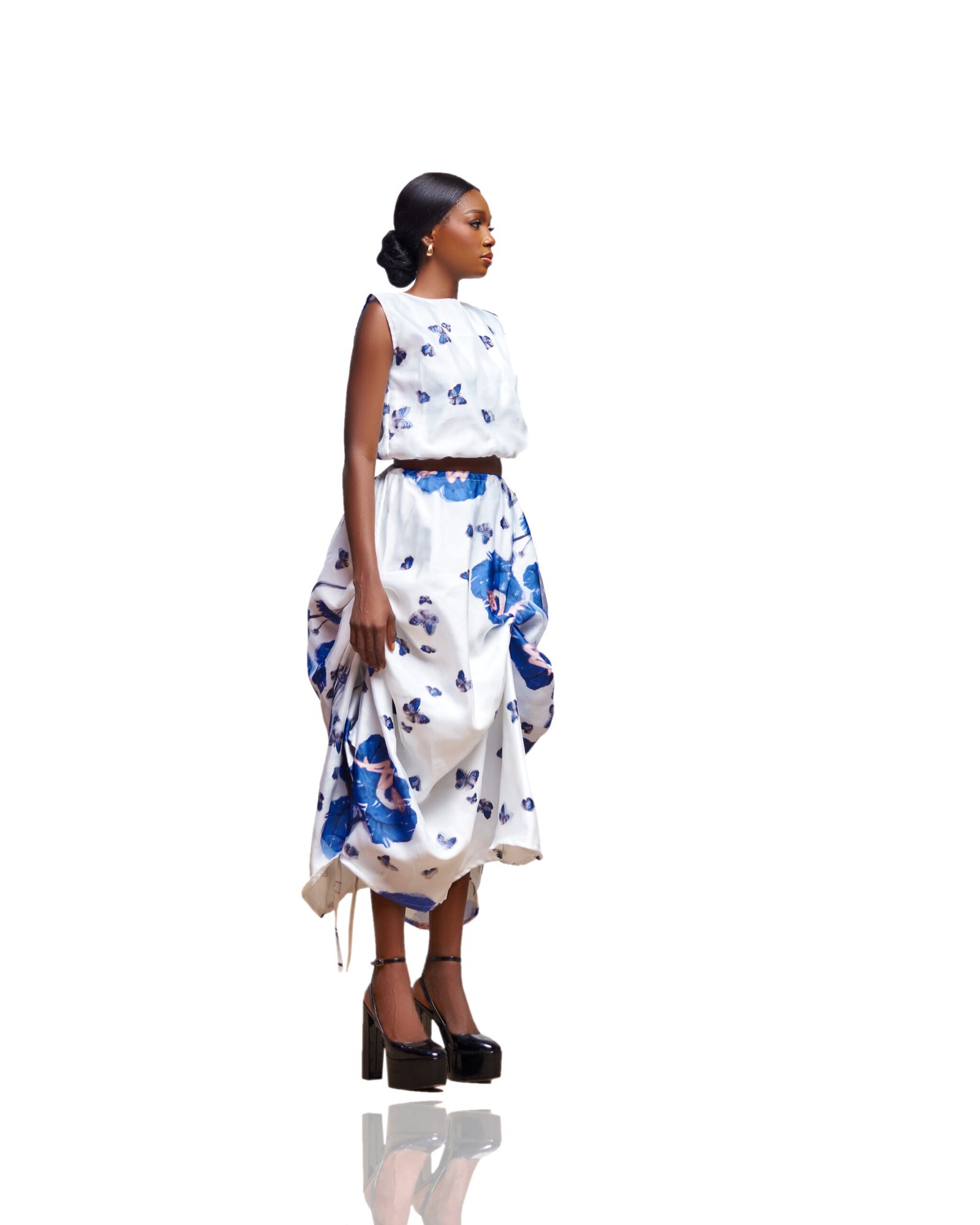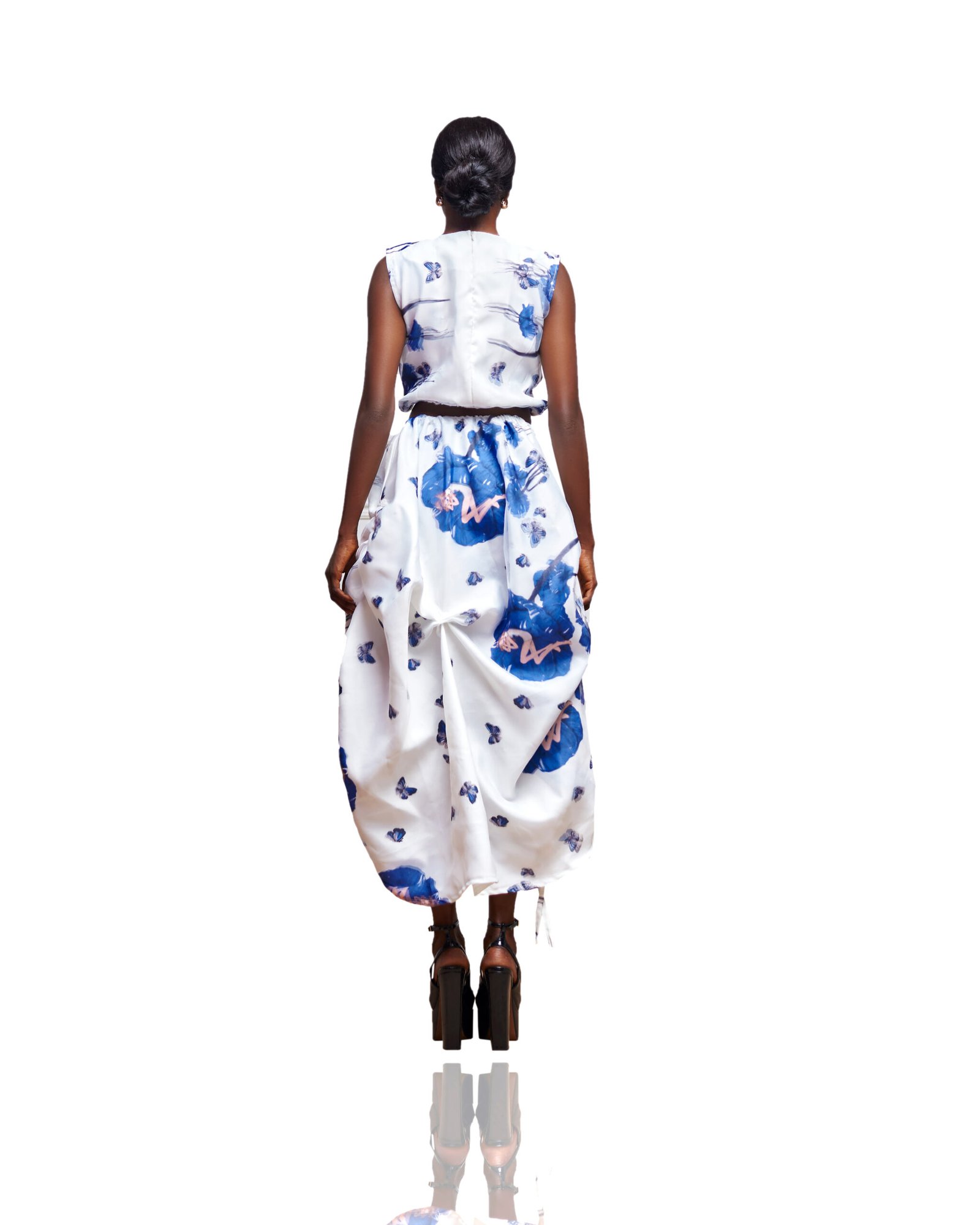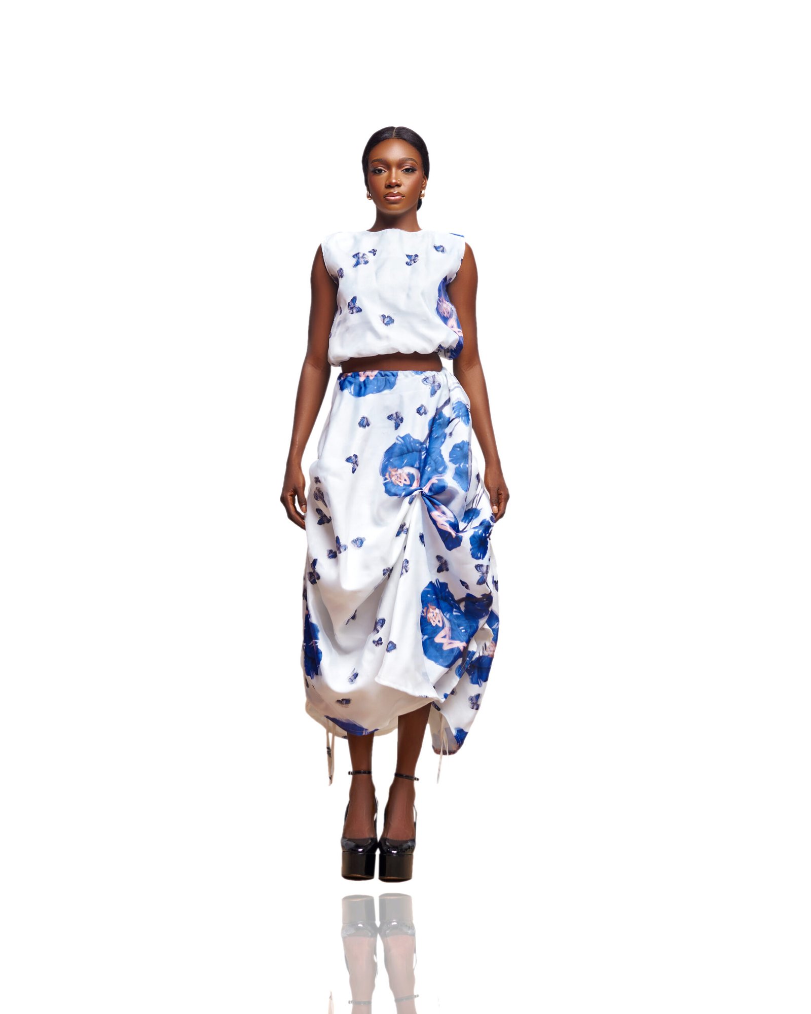 This refined yet fashion-forward ensemble features a sleeveless crop top and a voluminous midi skirt, both adorned in delicate blue and violet floral prints that evoke a dreamy, romantic feel.