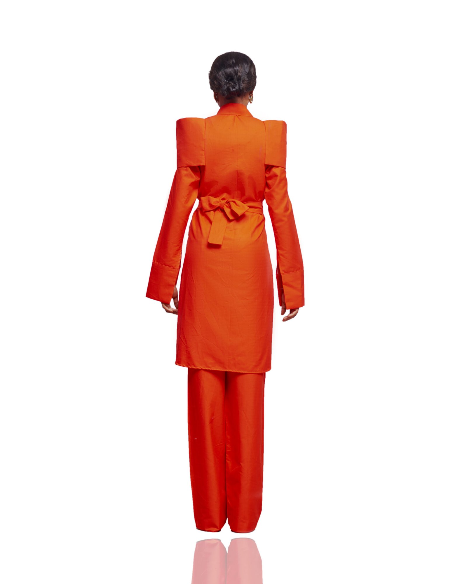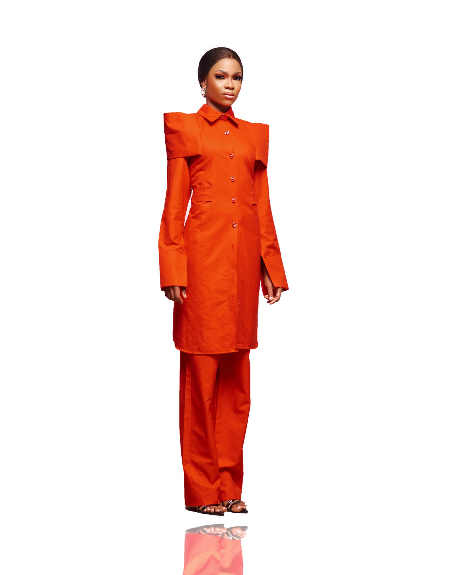 Bold Shoulder Shirt & Wide-Leg Pant Set in a striking orange hue. This two-piece ensemble is a modern take on tailored elegance, designed for the confident woman who isn’t afraid to stand out.