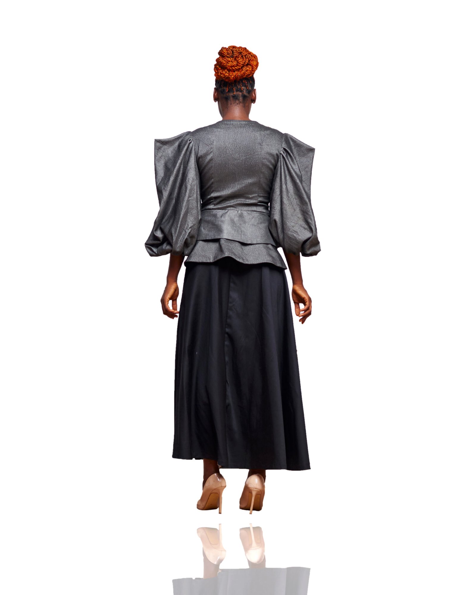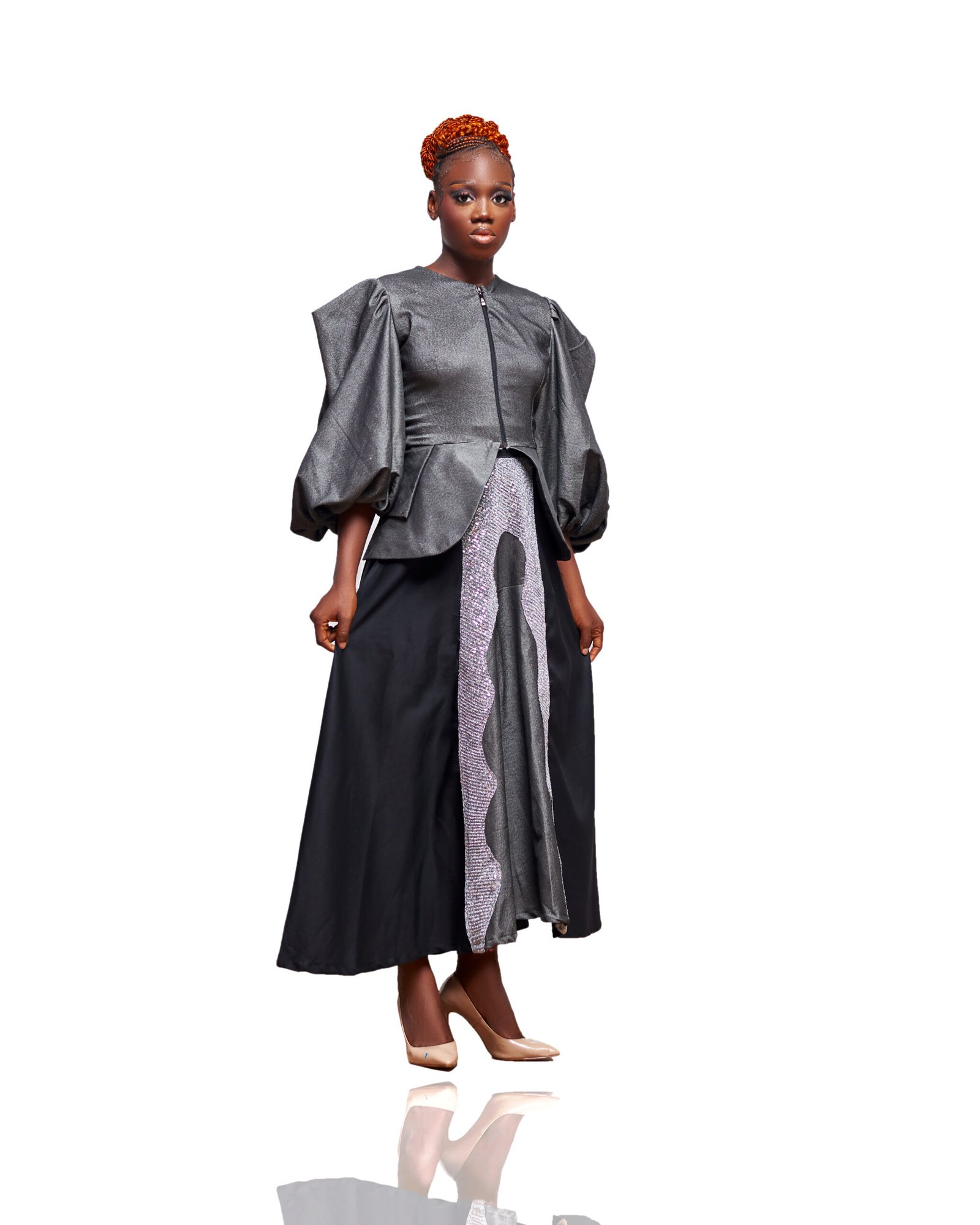 Puff Sleeve Top & Panel Skirt Set — a bold and artistic ensemble that fuses drama with refined elegance. The top features voluminous puff sleeves, a fitted waist, and a front zipper closure, all crafted in a sleek, structured fabric for a sculptural silhouette. A subtle peplum detail enhances the waistline, adding flair and sophistication.