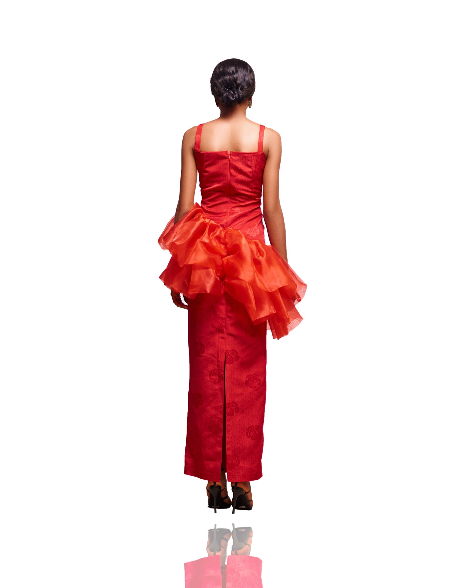 Ruffled Peplum Gown – Red, a standout piece designed for upscale occasions and glamorous evenings. Crafted from rich, jacquard-textured fabric with subtle floral motifs, this form-fitting gown is designed to flatter while making a bold style statement.