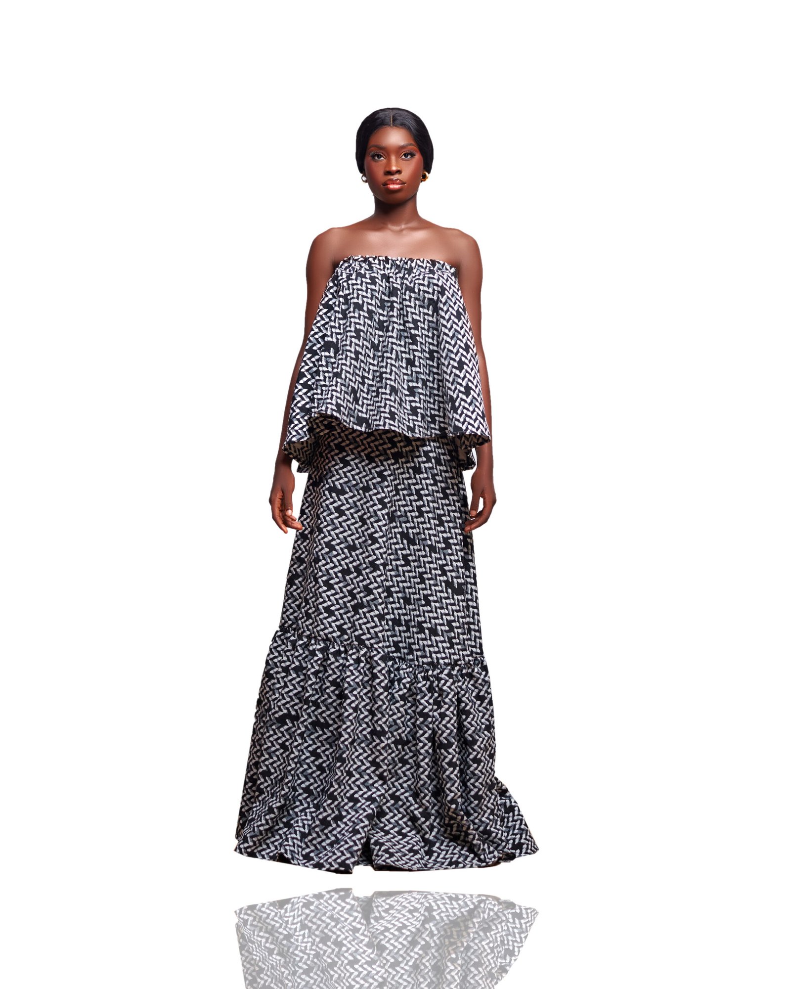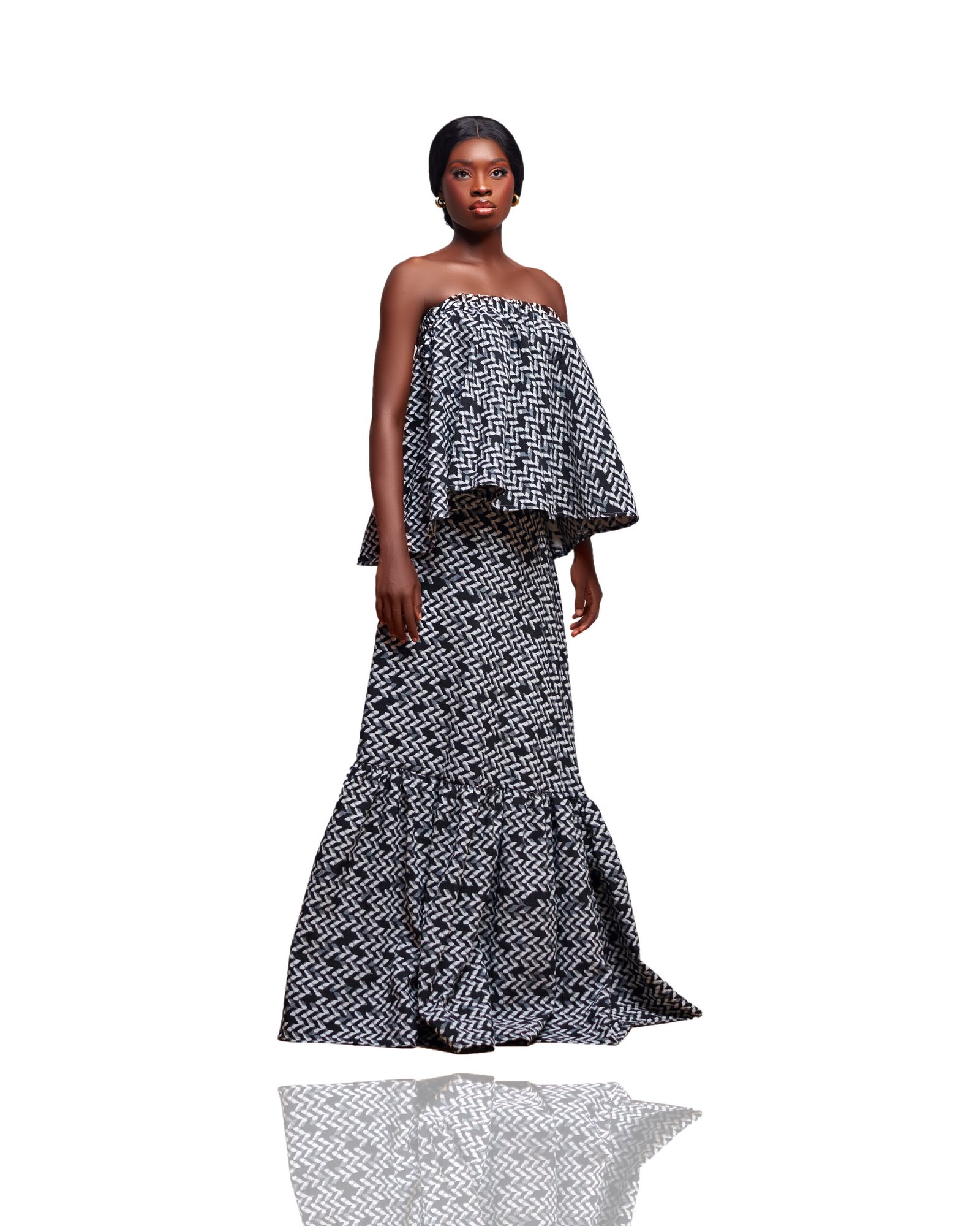 Strapless Geo Print Maxi Dress — a bold and modern take on timeless elegance. Featuring a striking black-and-white geometric pattern, this dress combines structured style with free-flowing comfort.